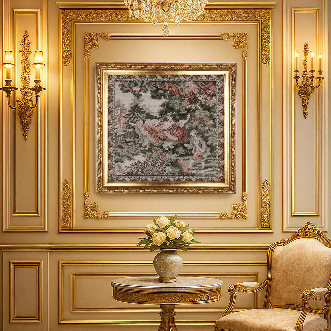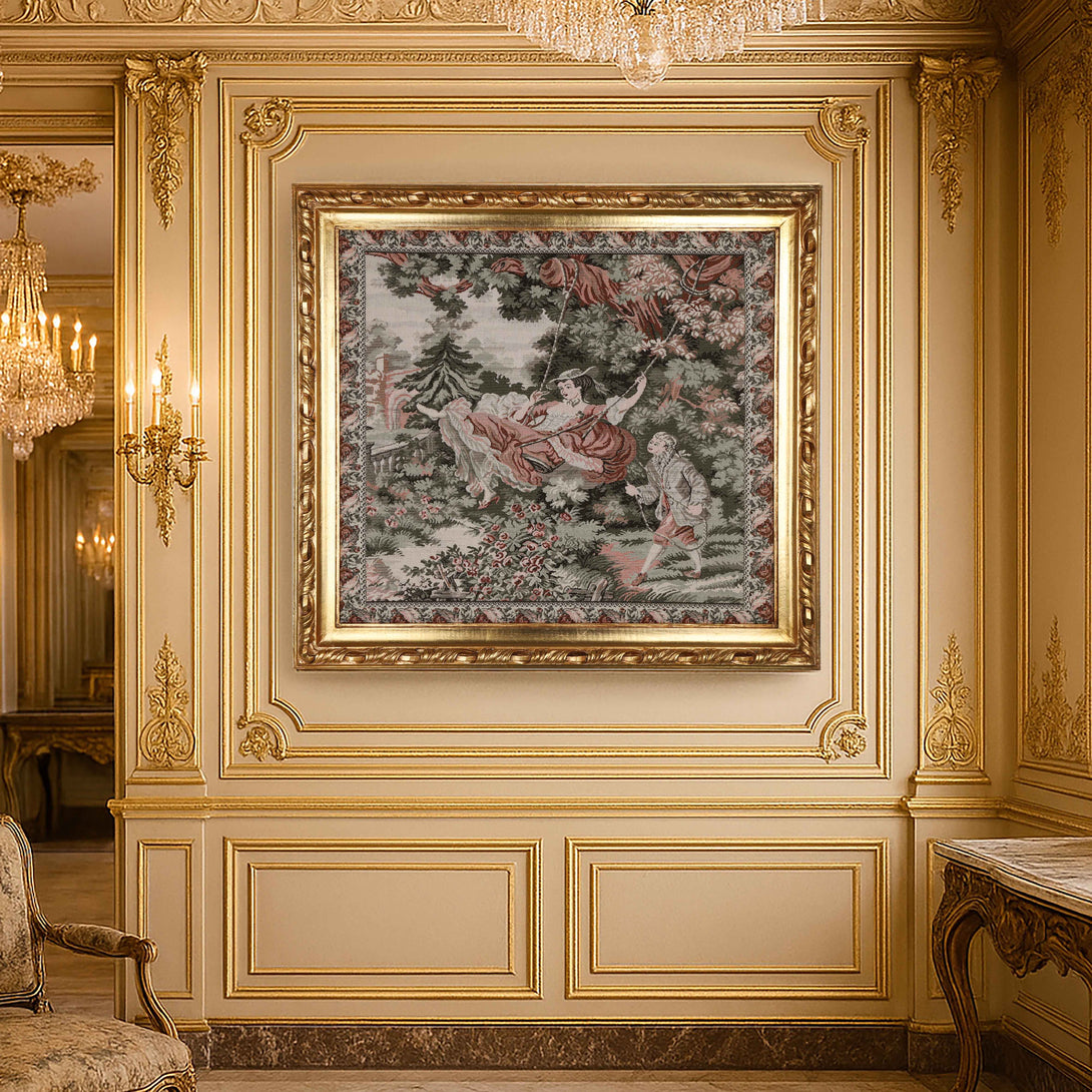 A Swing romance contains tapestry of European young woman and man in a beautiful garden. The frame is made of high quality wood, completely hand-carved and gilded with rich gold leaf.. The tapestry is made of Gobelin tapestry fabric. The fitted tableau to add a romantic touch to your home or office.