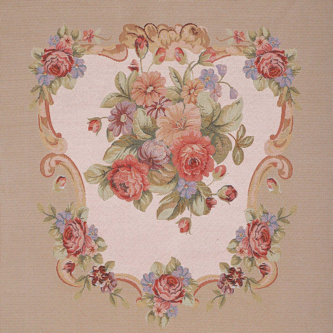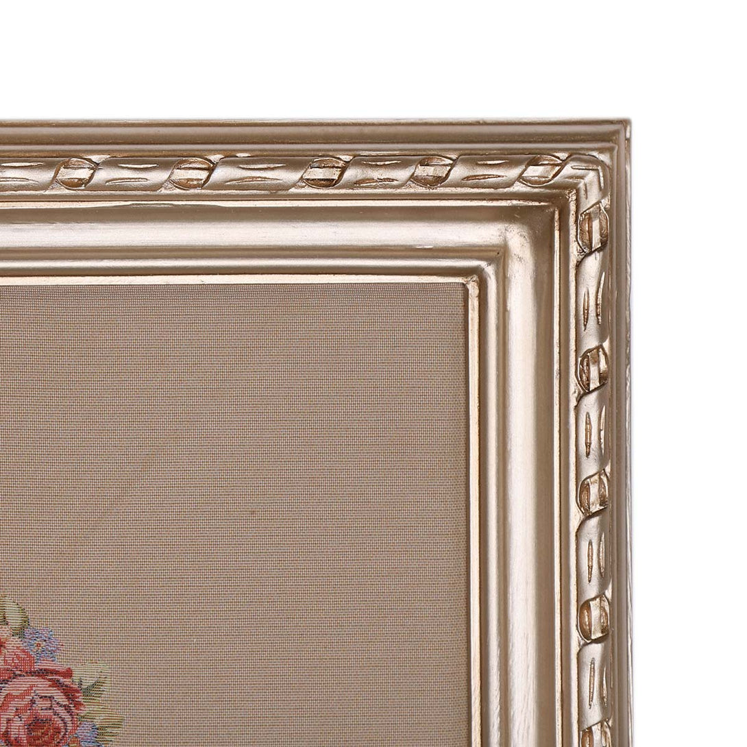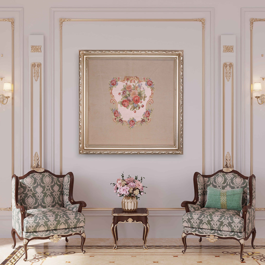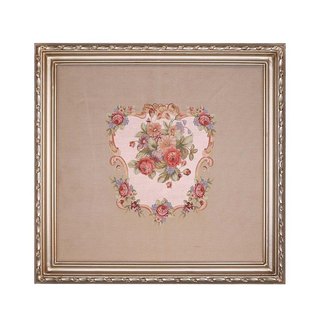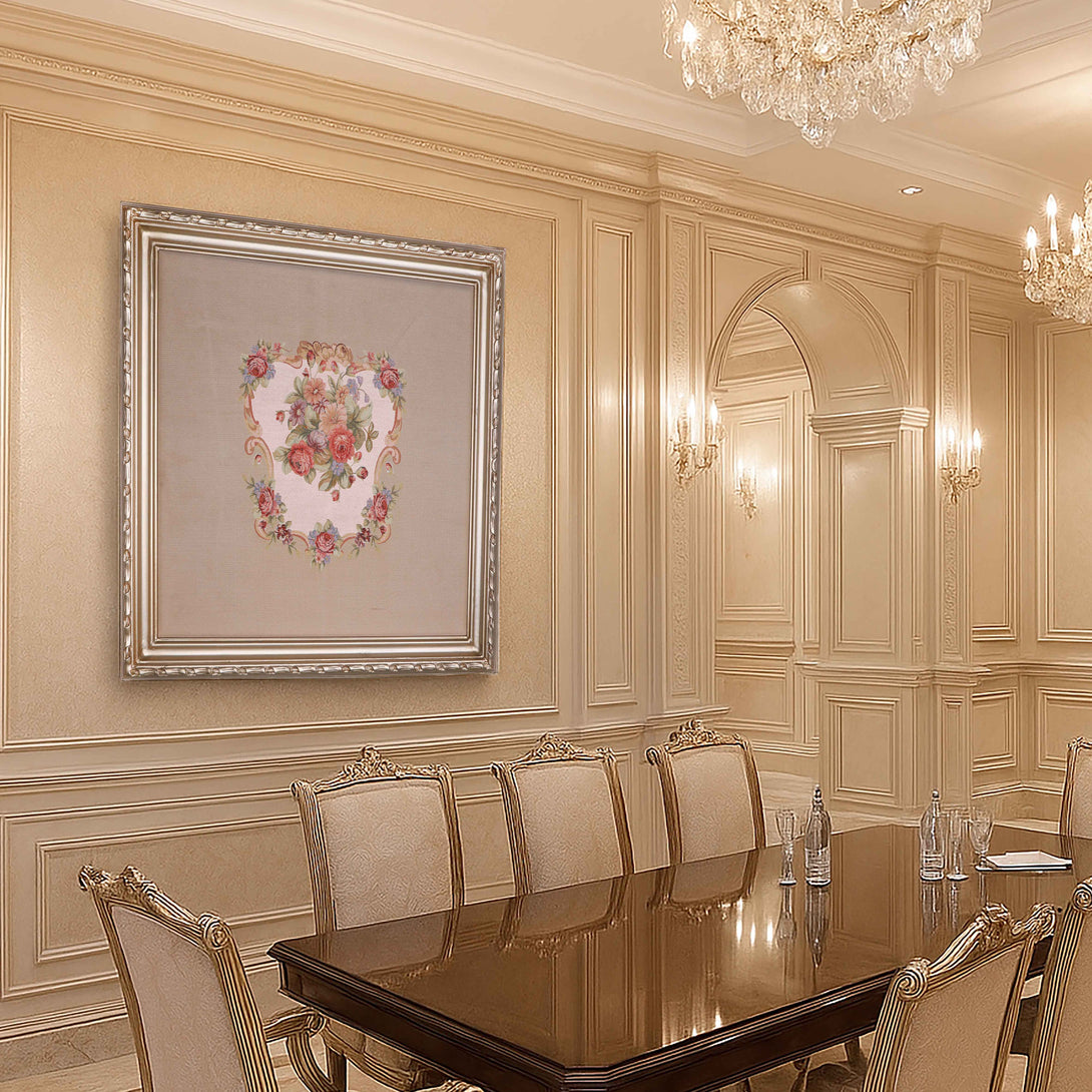 Royal wall art made of Gobelin Tapestry and natural wood frame. The wooden frame was carved totally by hand and finished by champagne color. The Ornamental Roses and its background are inspired by classic European artistry.