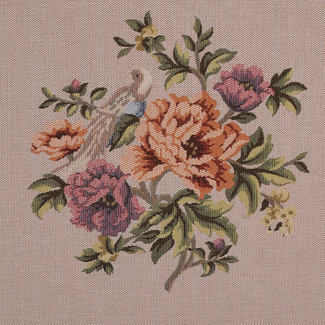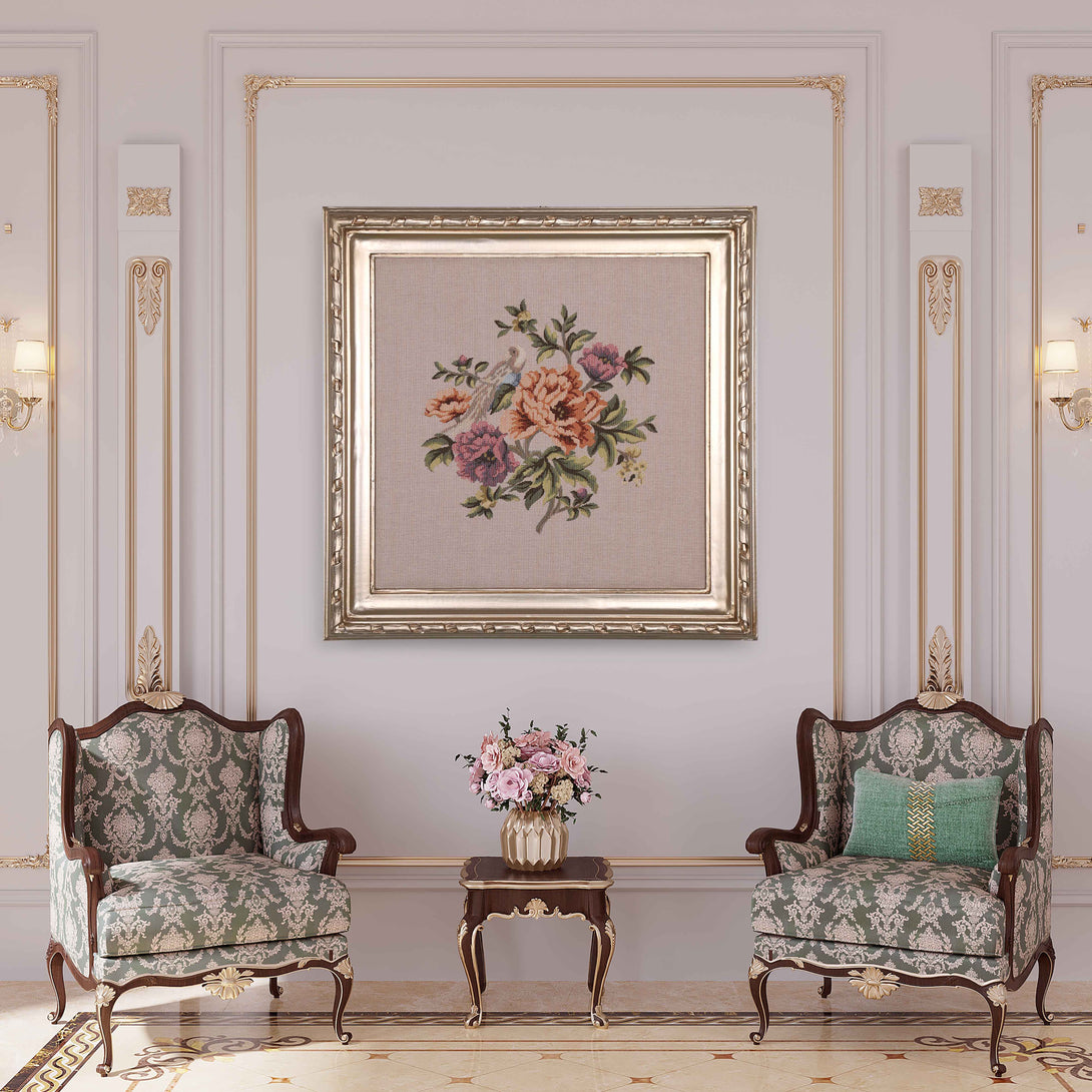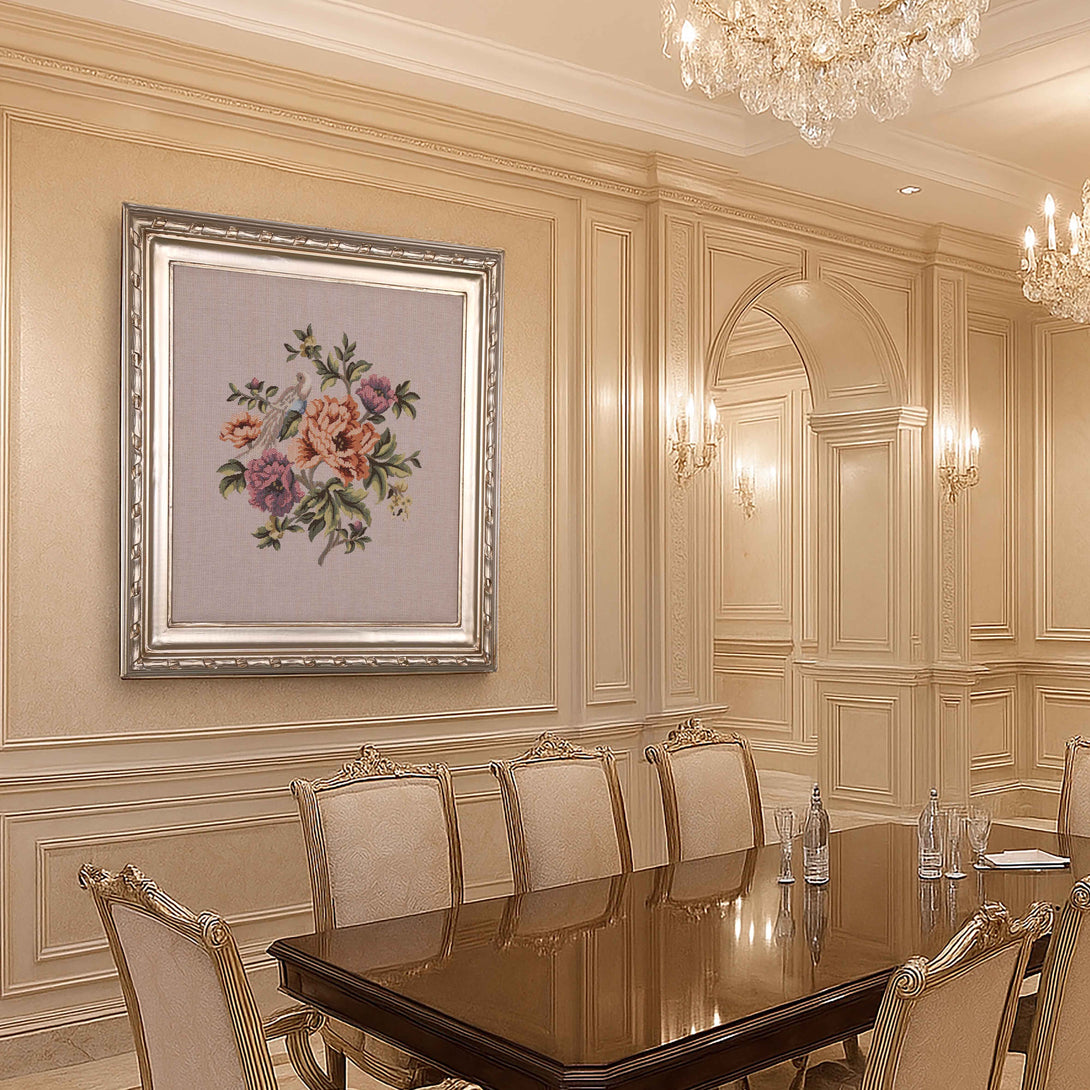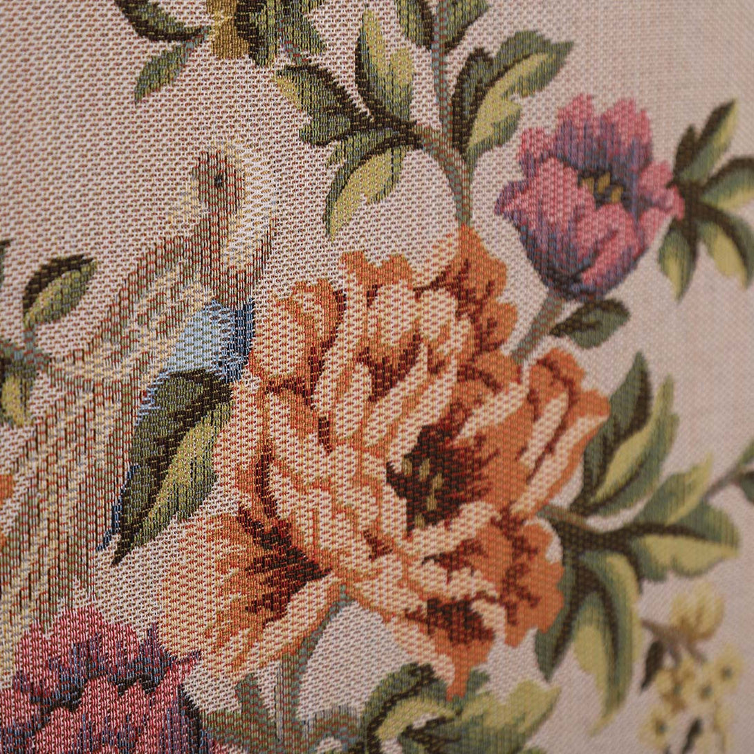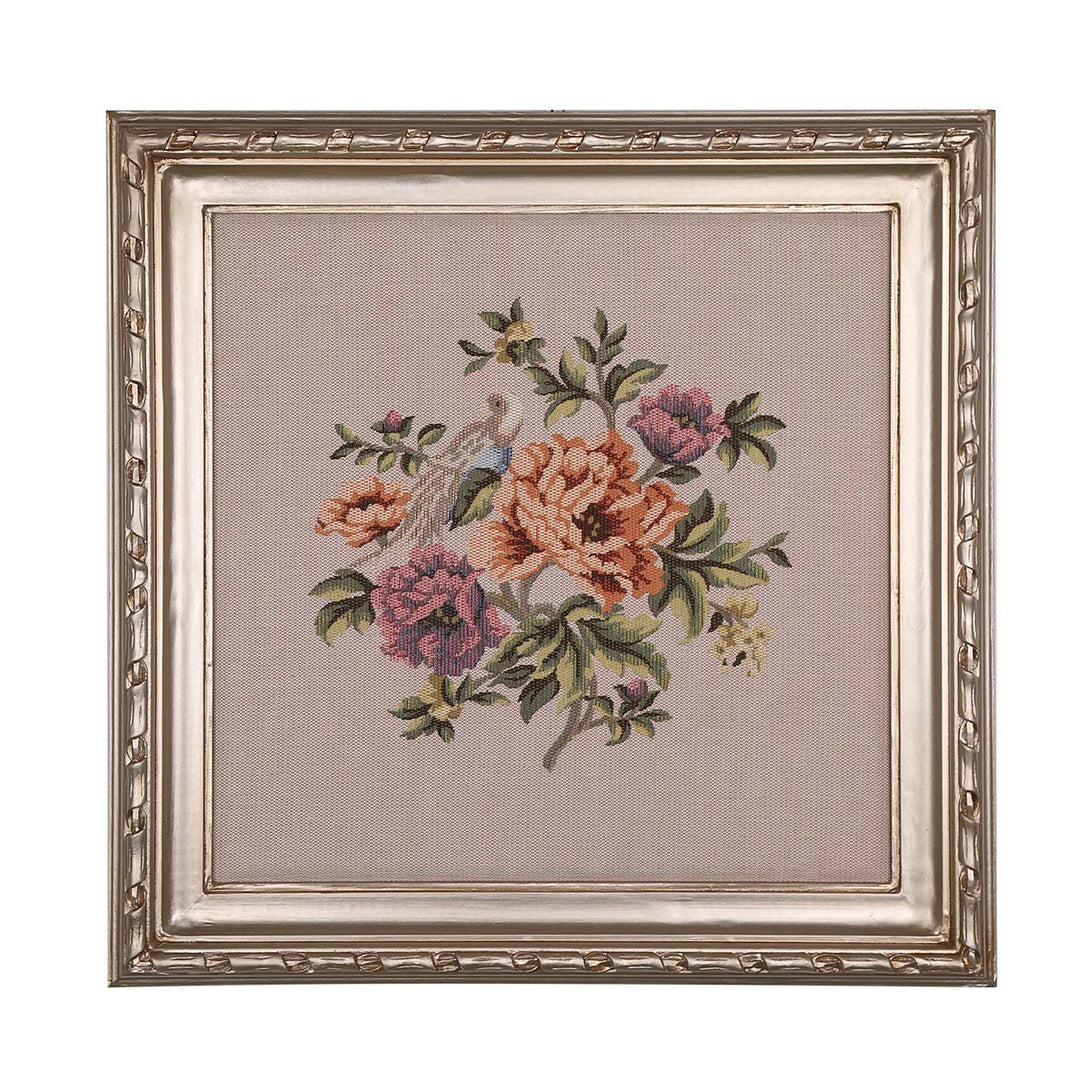 Beautiful Wall Art made of Gobelin Tapestry and natural wood frame. The wooden frame was carved totally by hand and finished by champagne color. The Ornamental Roses and its background are inspired by classic European artistry.