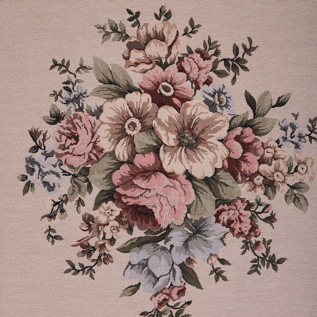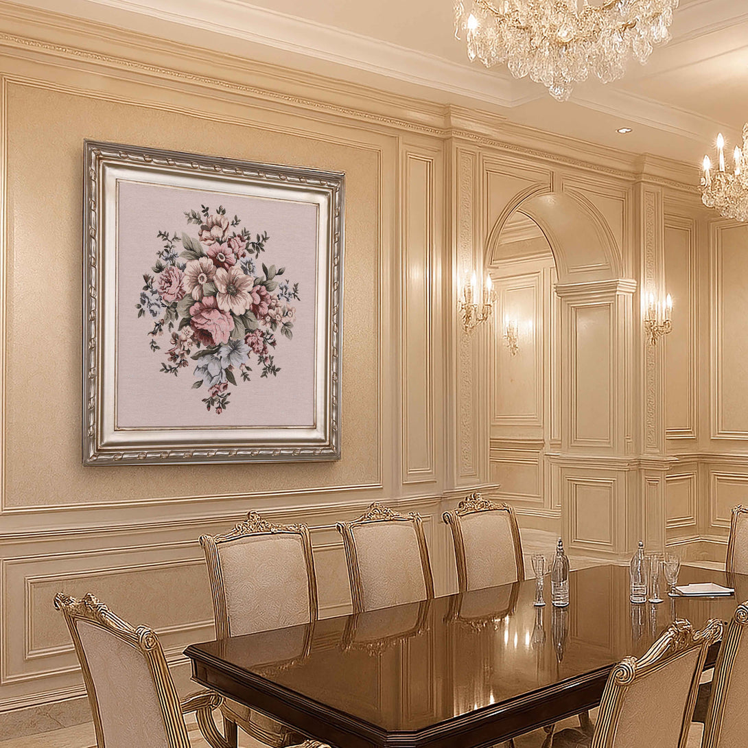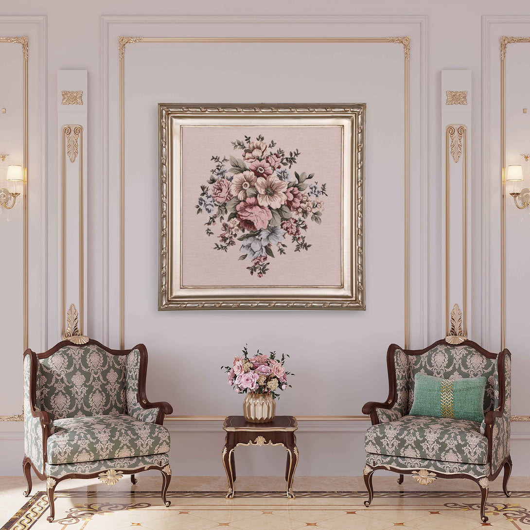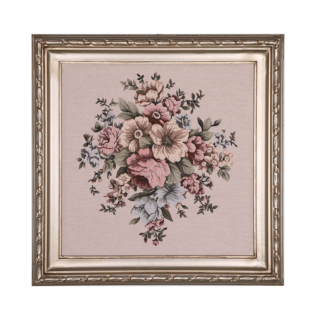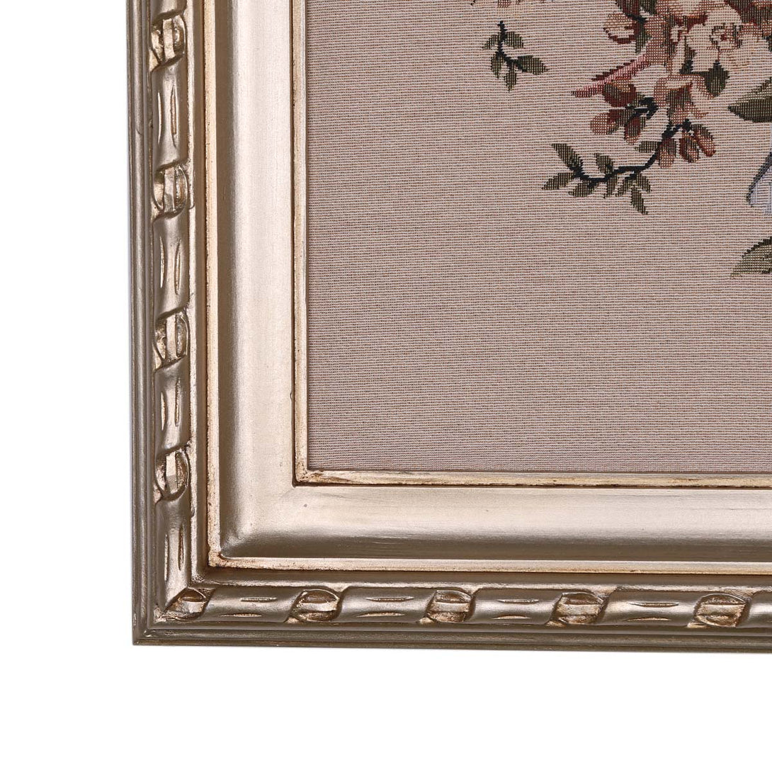 Floral wall art made of Gobelin Tapestry and wooden frame. The frame was carved totally by hand and finished by champagne color. Decorated with a lovely bouquet of flowers.