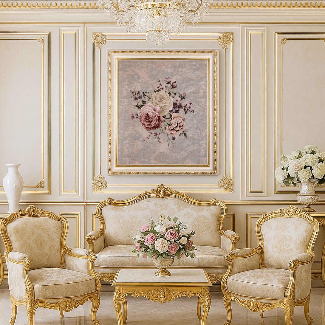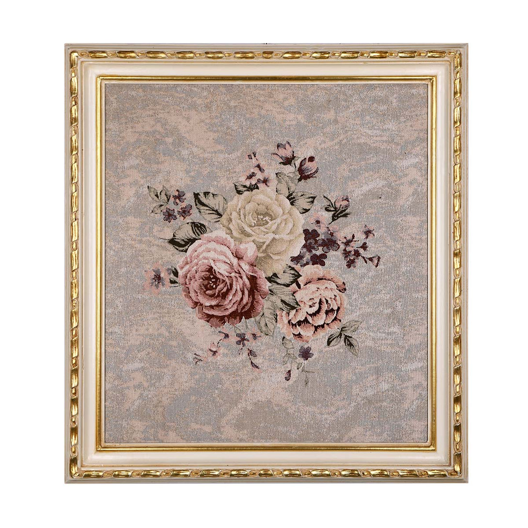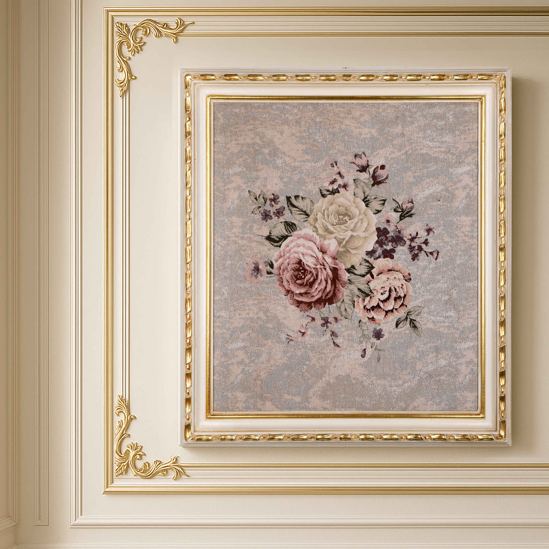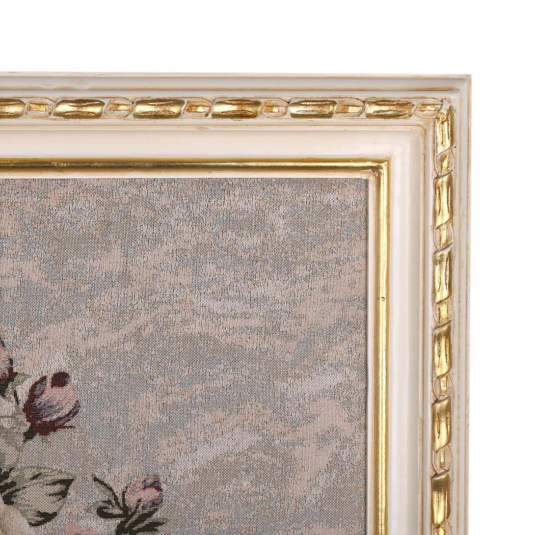 A lovely Wall Art made of Gobelin Tapestry and natural wood frame. The wooden frame is Hand carved and painted with white and gold color. The beautiful bouquet of flowers and its background are inspired by classic European artistry.