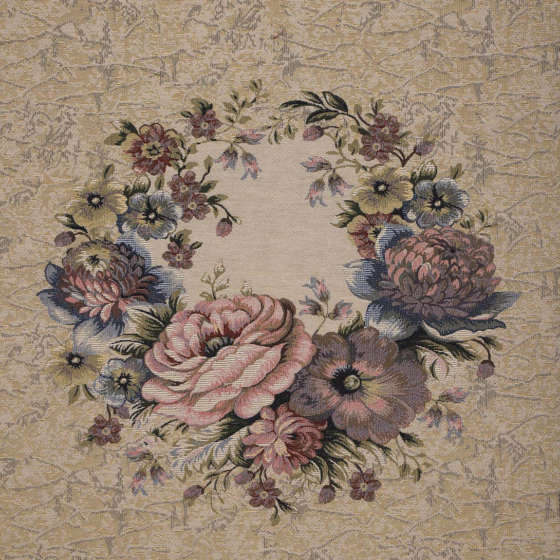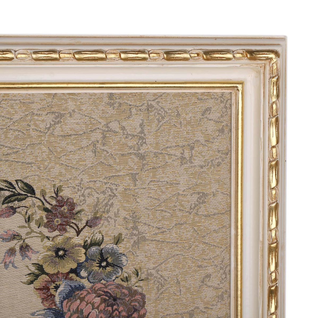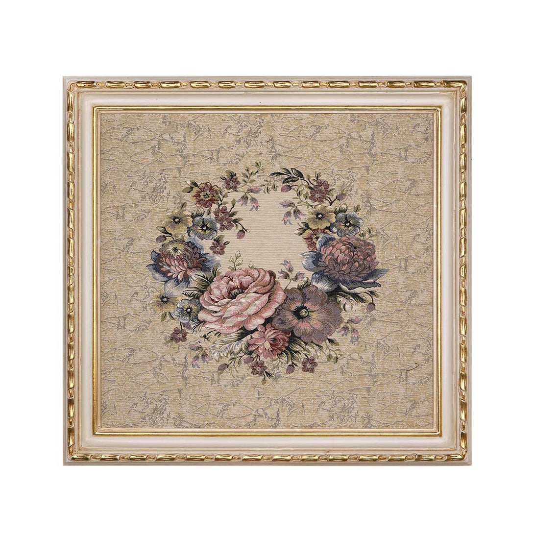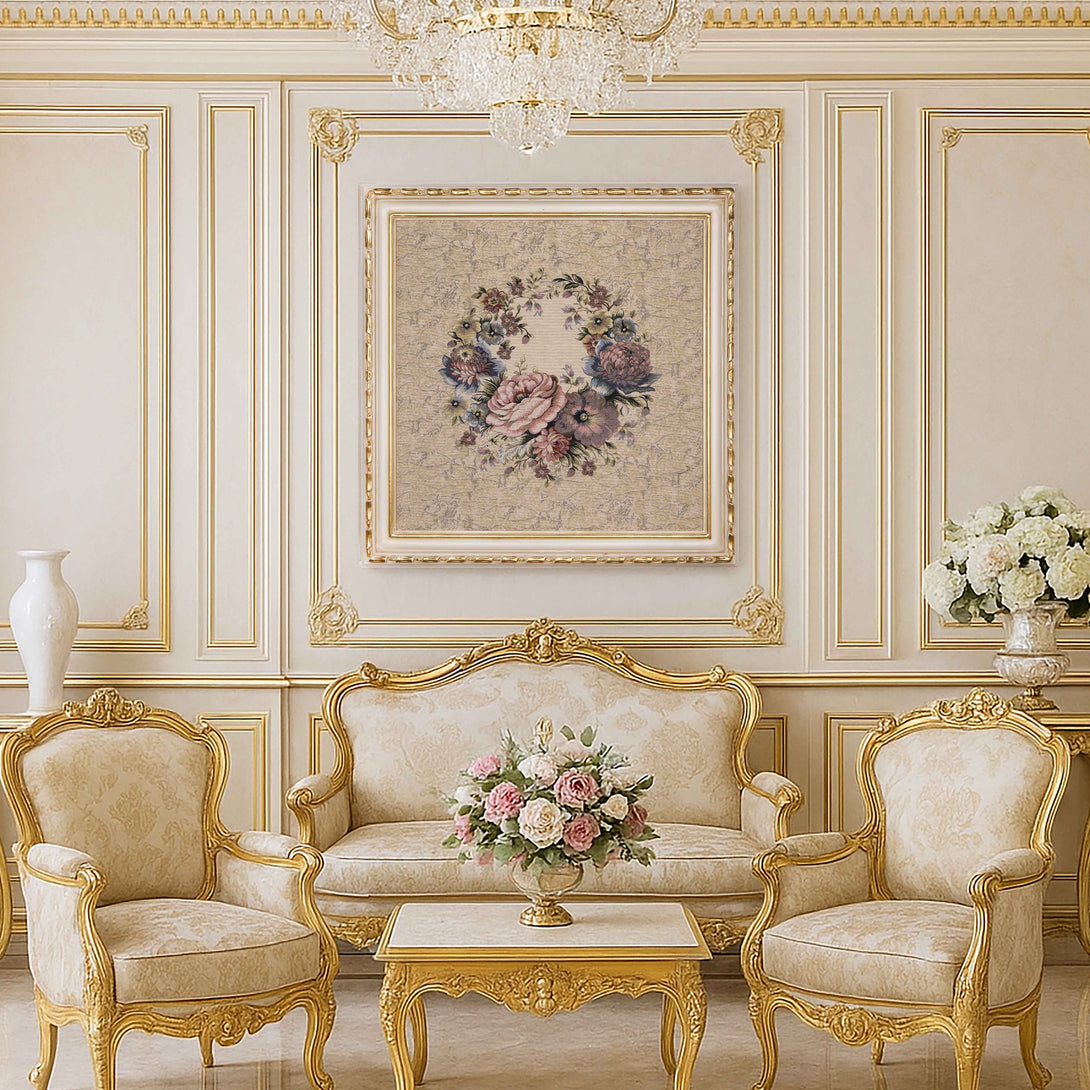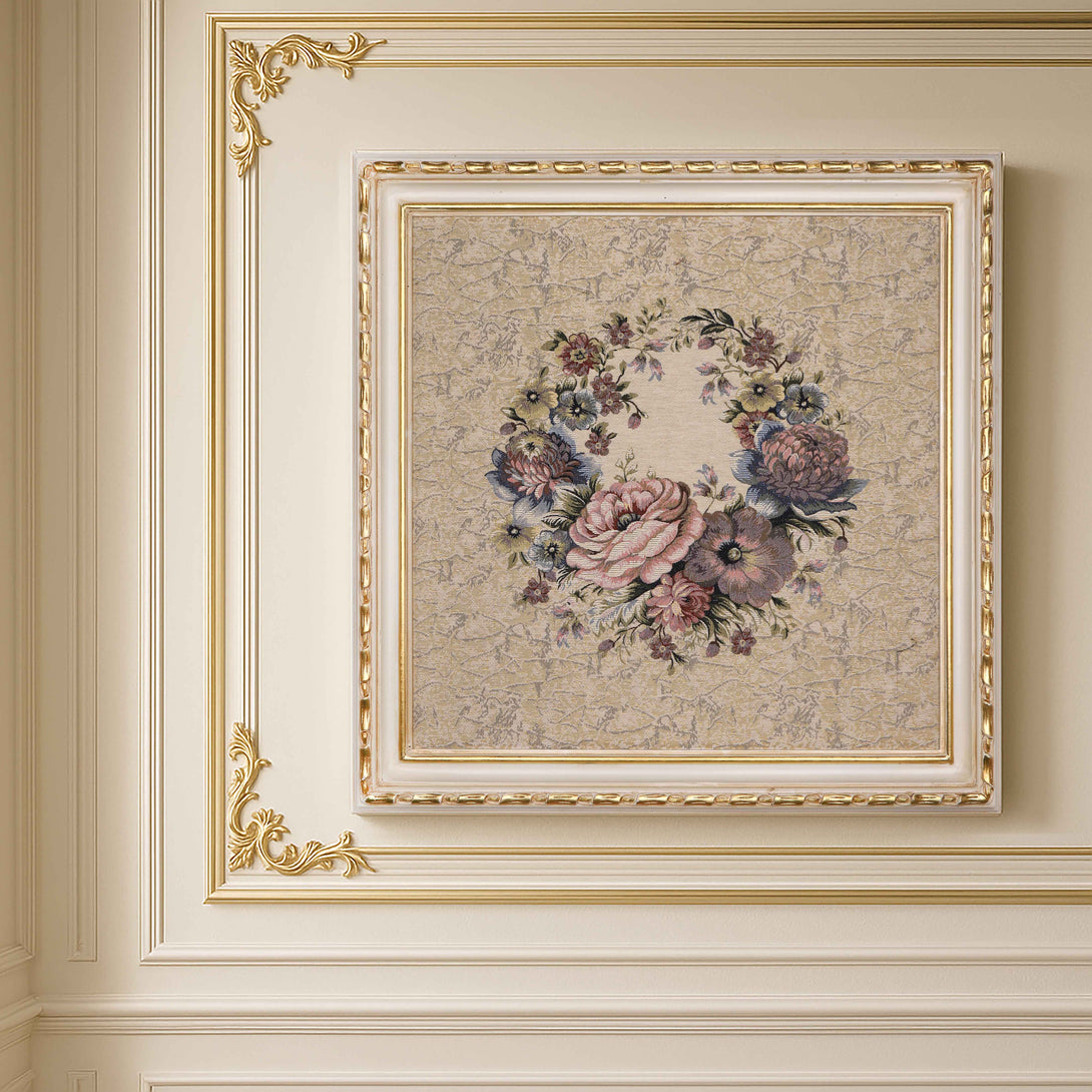 This gentle Wall Art made of Gobelin Tapestry and natural wood frame. The wooden frame is Hand carved and painted with white and gold color. The beautiful ring of flowers and its background are inspired by classic European artistry.