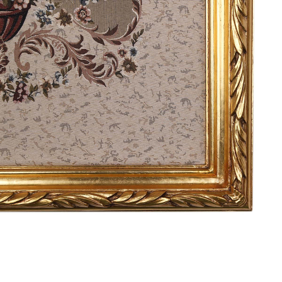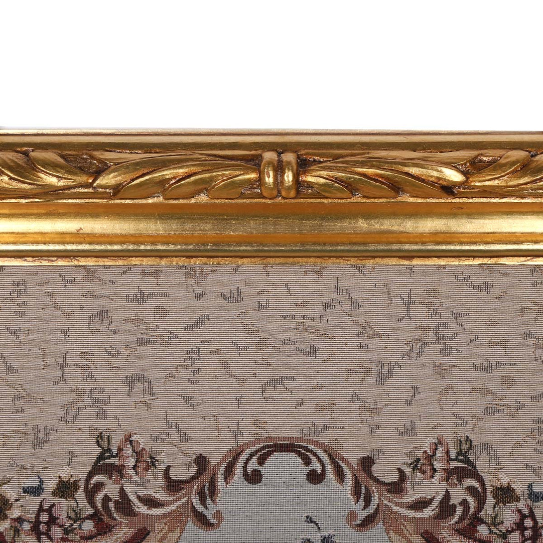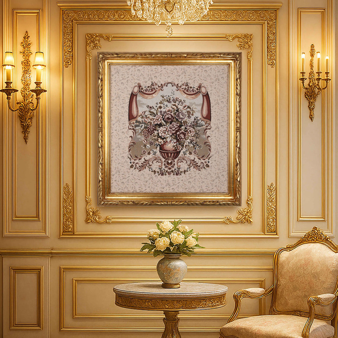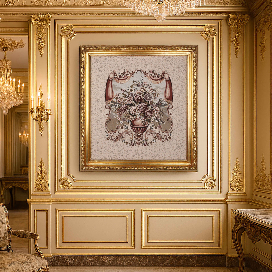 An ornate framed wall art offer a floral tapestry. The frame is made of high quality wood, completely hand-carved and gilded with gold leaves.. The tapestry is made of Gobelin fabric.The design features a bouquet of flowers in a decorative vase.