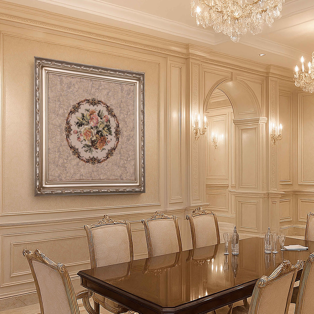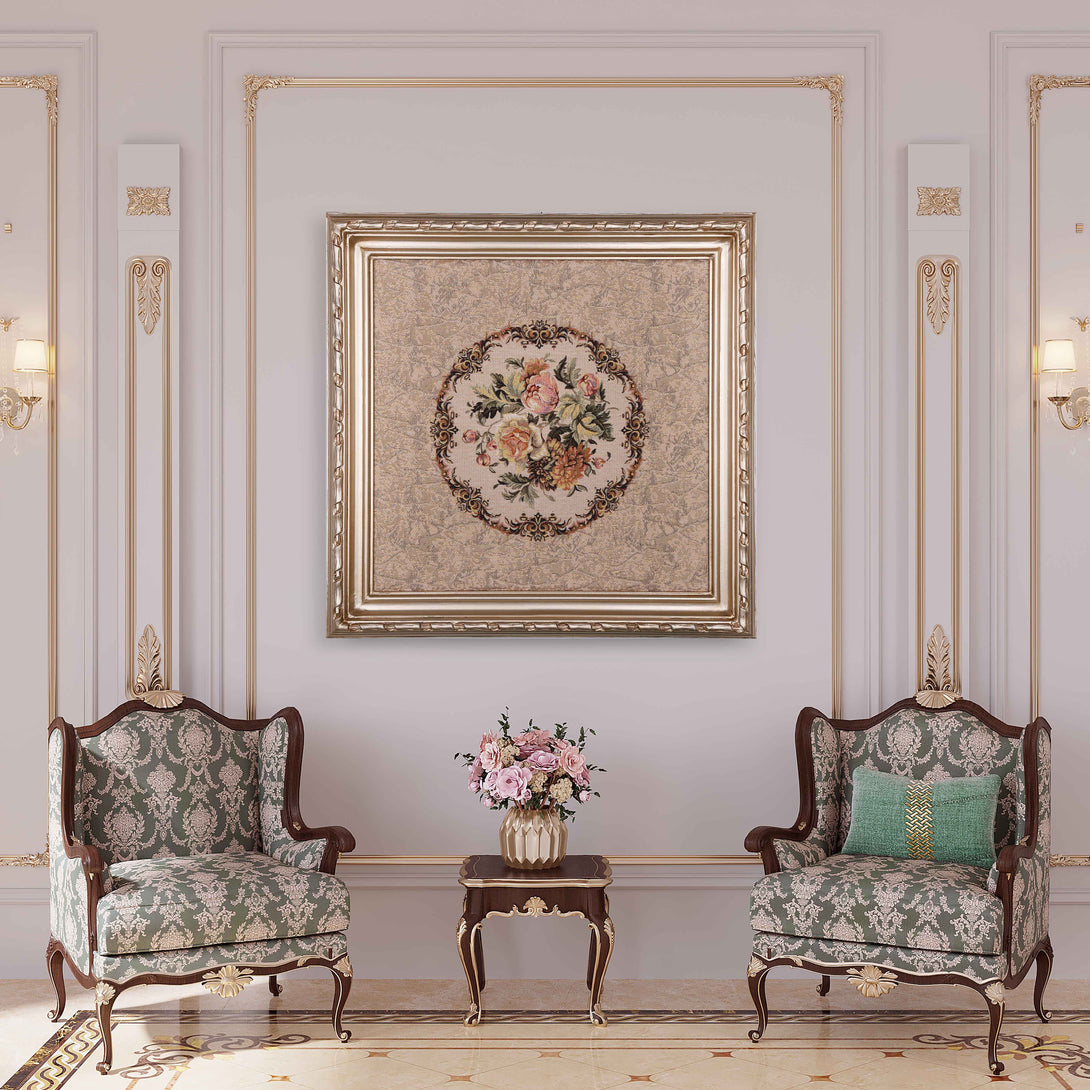 A Golden Blossom Medallion tapestry for wall decor.The frame is made of high quality wood, completely hand-carved and gilded with rich Champagne color. The tapestry is made of Gobelin tapestry fabric for beautiful flowers. The fitted tableau to add a calm touch to your home or office.