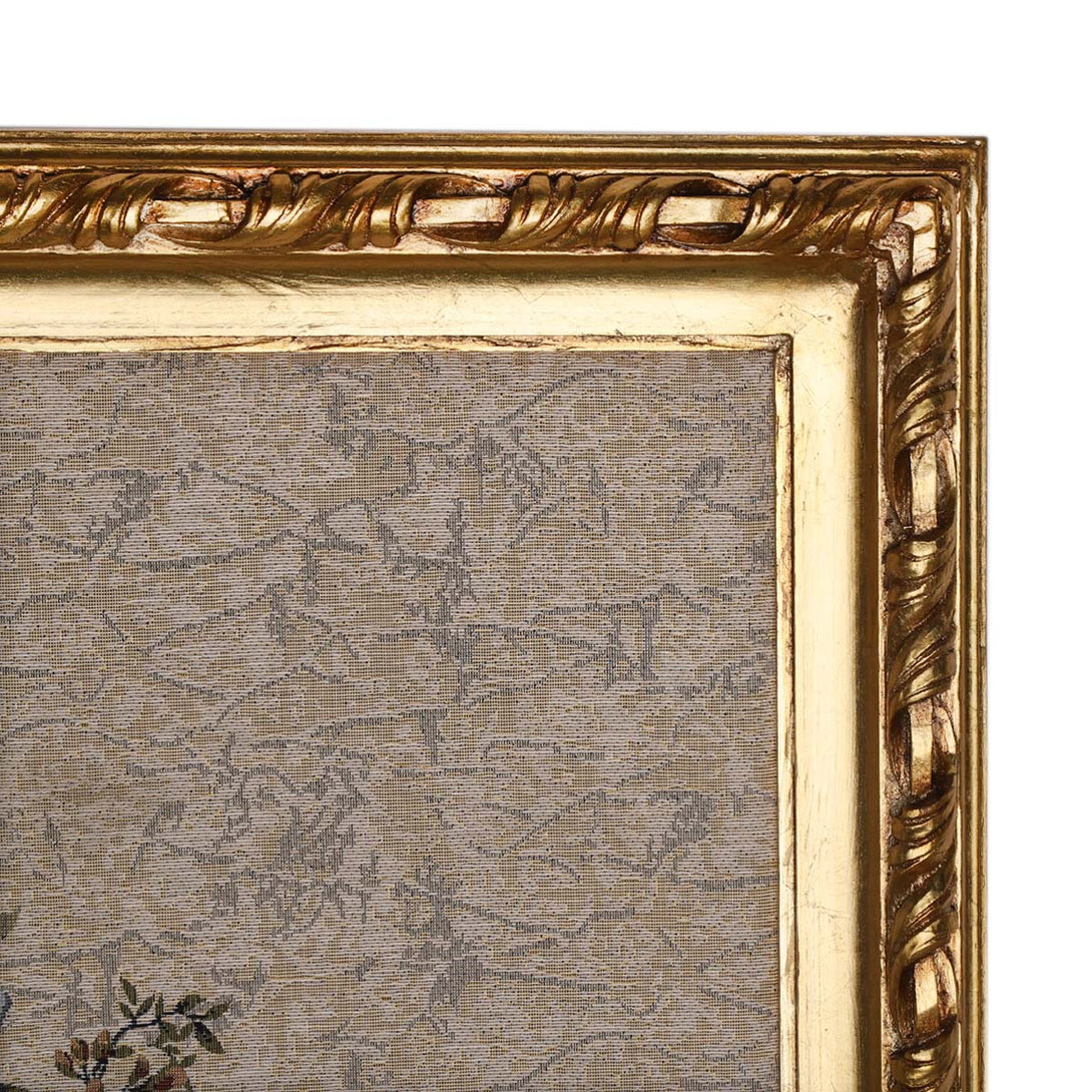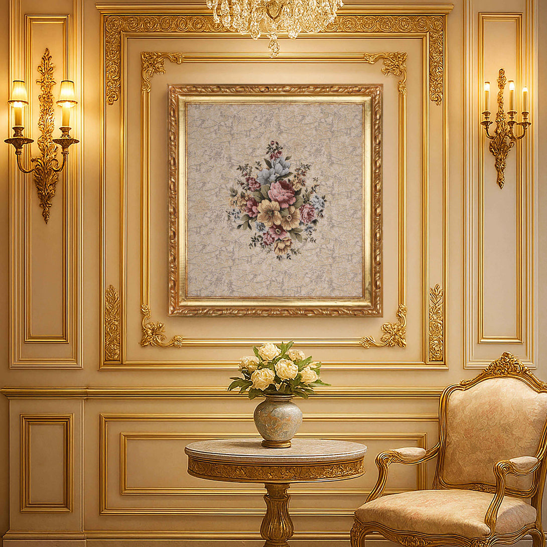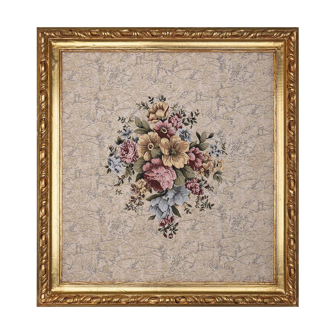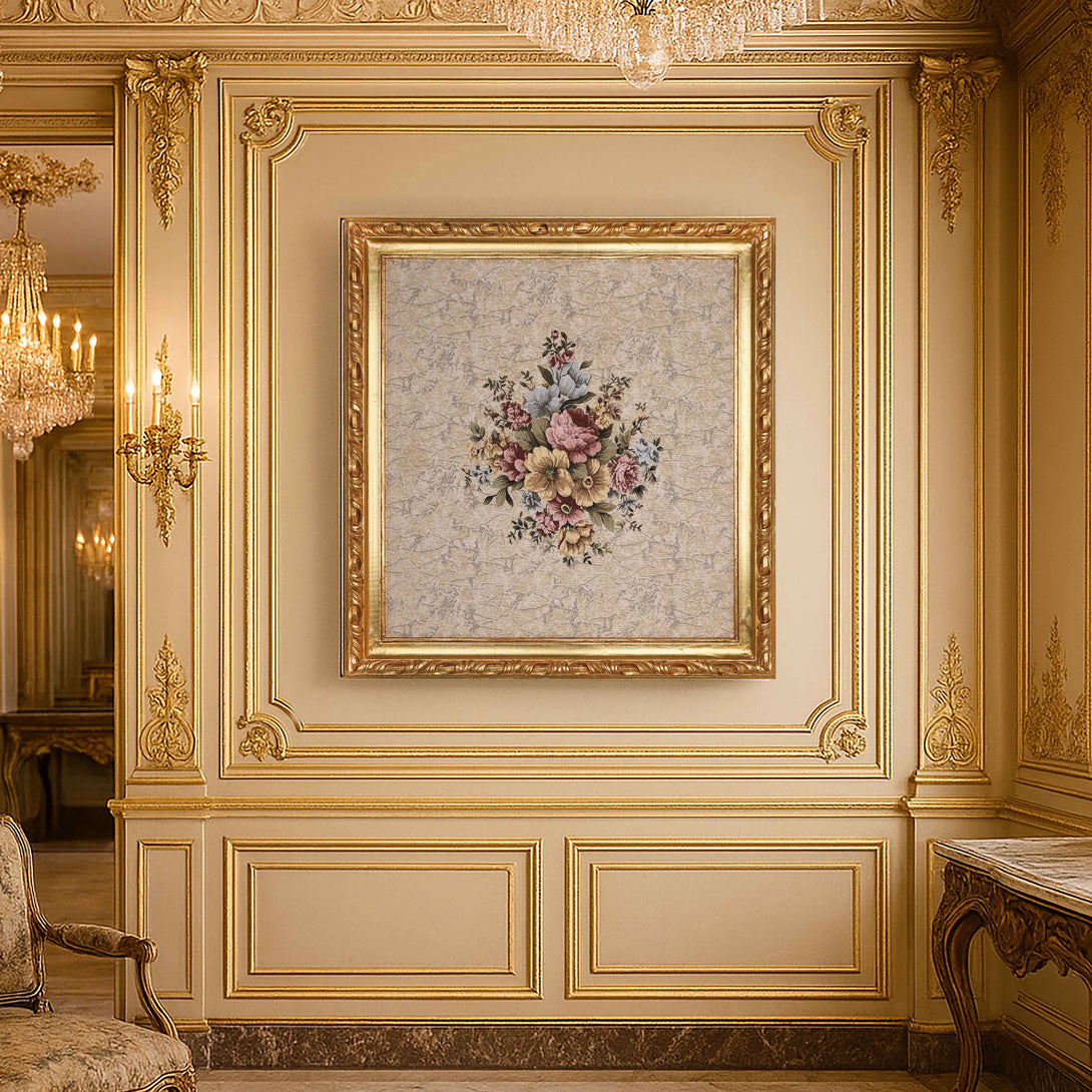 A Royal Wall Art made of Gobelin Tapestry and natural wood frame. The wooden frame is Hand carved and gilded with gold leaves. The beautiful bouquet of flowers and its background are inspired by classic European artistry.