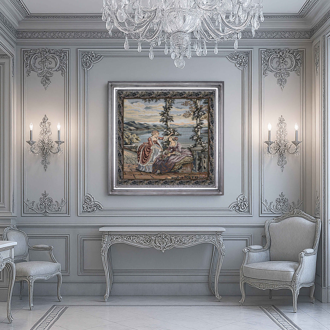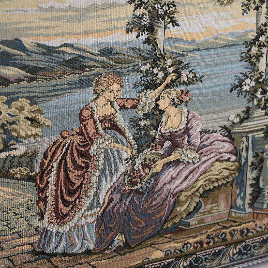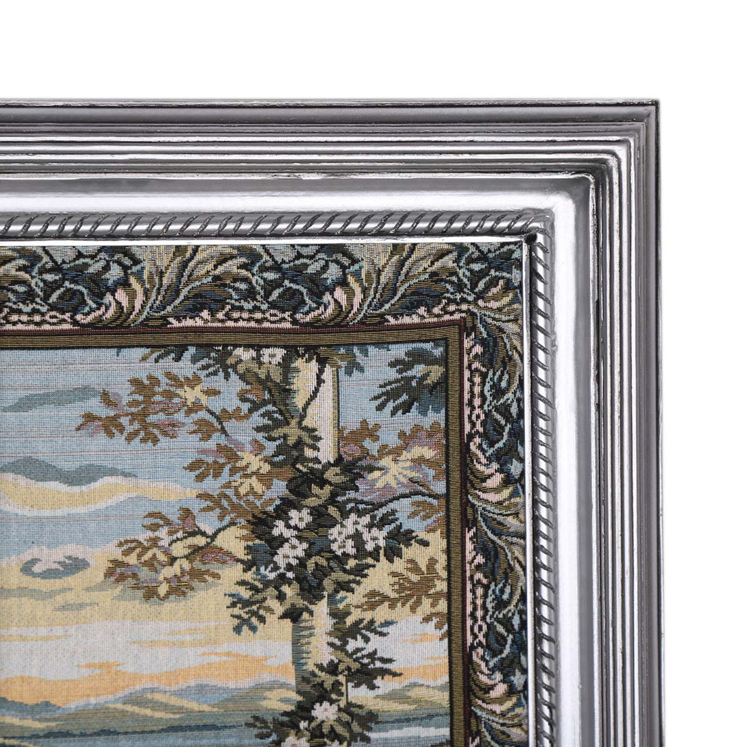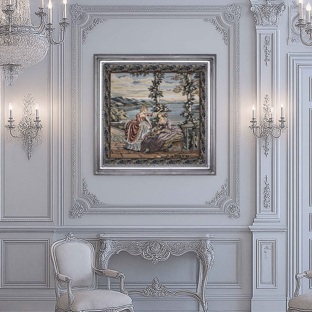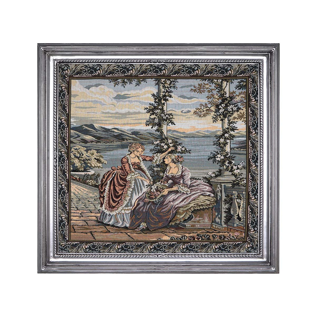 A wall art contains tapestry of beautiful landscape view of two young ladies talking in harmony at sunset. The frame is made of high quality wood, completely hand-carved and painted with shiny silver color. The tapestry is made of Gobelin tapestry fabric. The fitted tableau to add a unique touch to your wall art.